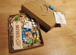 Die Geschenkbox, umweltbewusst aus FSC- und PEFC-zertifiziertem Kraftkarton hergestellt, enthält die liebevoll gestalteten Produkte und wird mit Naturgarn und farbig abgestimmten Holzperlen verziert.