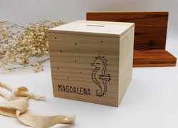 Zauberhafte Spardose aus Holz – personalisiert mit Seepferdchen und Name! Mach das Sparen für Kinder zu einem kleinen Abenteuer: Diese liebevoll gravierte Spardose, verziert mit einem schönen Seepferdchen-Motiv und dem Namen deiner Wahl, ist nicht nur praktisch, sondern auch ein wunderschönes Erinnerungsstück. Sie begleitet kleine Schatzsammler viele Jahre lang und sorgt dafür, dass Münzen und Scheine sicher aufbewahrt werden. Ideal als personalisiertes Geschenk zur Geburt, Taufe, zum Geburtstag, zur Erstkommunion, zu Ostern oder Weihnachten. Statt einer gewöhnlichen Spardose erhältst du hier ein persönliches Einzelstück, das perfekt ins Kinderzimmer passt.